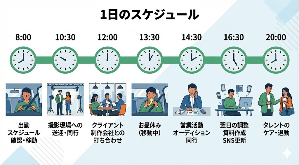 タレントと一緒に行動するため、早朝・深夜・休日対応も珍しくありませんが、同時に「現場の空気を肌で感じられるやりがい」も大きい職種です。