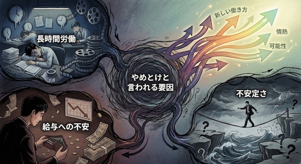 「憧れの仕事ができるのだから、給料は安くてもいいだろう」という、いわゆる「やりがい搾取」が横行していた時代もありました。特に下請け構造の末端にある制作会社などでは、業務量に対して対価が見合わないケースが散見されました。