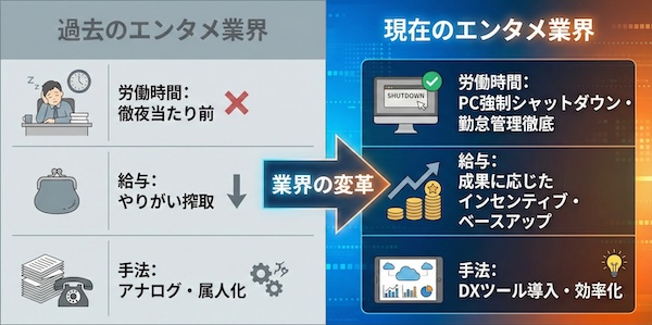 この記事では、エンタメ業界専門の転職エージェントである「エンタメジョブス」が、ネット上の噂の真偽と、業界内部で起きている「ホワイト化」のリアル、そして絶対に失敗しないための企業の選び方を包み隠さず解説します。