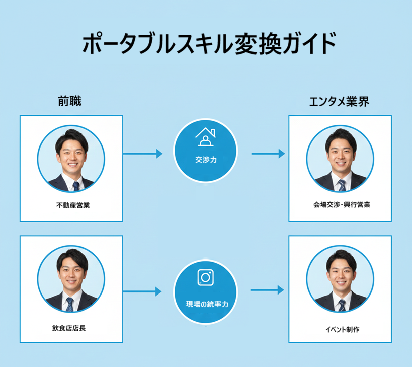 ・営業職からのピボット: 不動産や商社の営業マンが、ライブ制作会社の「会場交渉・協賛営業」へ転身。3年でイベントプロデューサーに昇進し、前職の年収水準(600万〜700万円)を維持しながら、作品のクレジットに名前が載るやりがいを手に入れた事例があります。